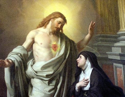 7. Cristo escogió a Santa Margarita María de Alacoque (1647-1690), una humilde monja visitandina del monasterio de Paray-le-Monial, para revelarle los deseos de su Corazón y para confiarle la tarea de impartir nueva vida a la devoción. Nada indica que esta piadosa religiosa haya conocido la devoción antes de las revelaciones, o que, al menos, haya prestado alguna atención a ella. Estas revelaciones fueron muy numerosas y son notables las siguientes apariciones: la que ocurrió en la fiesta de San Juan, en la que Jesús permitió a Margarita María, como antes lo había hecho con Santa Gertrudis, recargar su cabeza sobre su Corazón, y luego le descubrió las maravillas de su Amor, diciéndole que deseaba que fueran conocidas por toda la humanidad y que los tesoros de su bondad fueran difundidos. Añadió que Él la había escogido a ella para esta obra (27 de diciembre, probablemente del 1673). En otra, probablemente distinta de la anterior, Él pidió ser honrado bajo la figura de su corazón de carne. En otra ocasión, apareció radiante de amor y pidió que se practicara una devoción de amor expiatorio: la comunión frecuente, la comunión cada primer viernes de mes, y la observancia de la Hora Santa (probablemente en junio o julio de 1674). En otra, conocida como la "gran aparición", que tuvo lugar en la octava de Corpus Christi, 1675, probablemente el 16 de junio, fue cuando Jesús dijo: "Mira el Corazón que tanto ha amado a los hombres... en vez de gratitud, de gran parte de ellos yo no recibo sino ingratitud". Y le pidió que se celebrase una fiesta de desagravio el viernes después de la octava de Corpus Christi, advirtiéndole que debía consultar con el Padre de la Colombière, por entonces superior de la pequeña casa jesuita en Paray. Finalmente, aquellas en las que el Rey solicitó solemne homenaje y determinó que fuera la Visitación y los jesuitas quienes se encargasen de propagar la nueva devoción. Pocos días después de la "gran aparición", en junio de 1675, Margarita María informó de todo al Padre de la Colombière y este último, reconociendo la acción del [[Espíritu Santo]], se consagró él mismo al Sagrado Corazón, dio instrucciones a la visitandina para que pusiera por escrito los detalles de la aparición y utilizó cuanta oportunidad tuvo para discretamente circular ese relato en Francia e Inglaterra. A su muerte, el 15 de febrero de 1682, se encontró en su diario de retiros espirituales una copia manuscrita suya del relato que él había solicitado de Margarita María, con unas breves reflexiones acerca de la utilidad de la devoción. Ese diario, junto con el relato y un precioso "ofrecimiento" al Sagrado Corazón en el que se explica claramente la devoción, fue publicado en Lyón en 1684. El librito fue muy leído, aún en Paray, aunque no dejó de causar una "horrible confusión" a Margarita María, quien, a pesar de todo, decidió aprovecharlo para extender su preciada devoción. Se unieron al movimiento Moulins, con la Madre de Soudeilles, Dijon, con la Madre de Saumaise y la hermana Joly, Semur, con la Madre Greyfié y hasta Paray, que al principio se había resistido. Fuera de las Visitandinas, sacerdotes, religiosos y laicos abrazaron la causa. En especial un capuchino, los dos hermanos de Margarita María y algunos jesuitas, entre los que estaban los padres Croiset y Gallifet, quienes estaban destinados a desempeñar un papel importante en pro de la devoción.