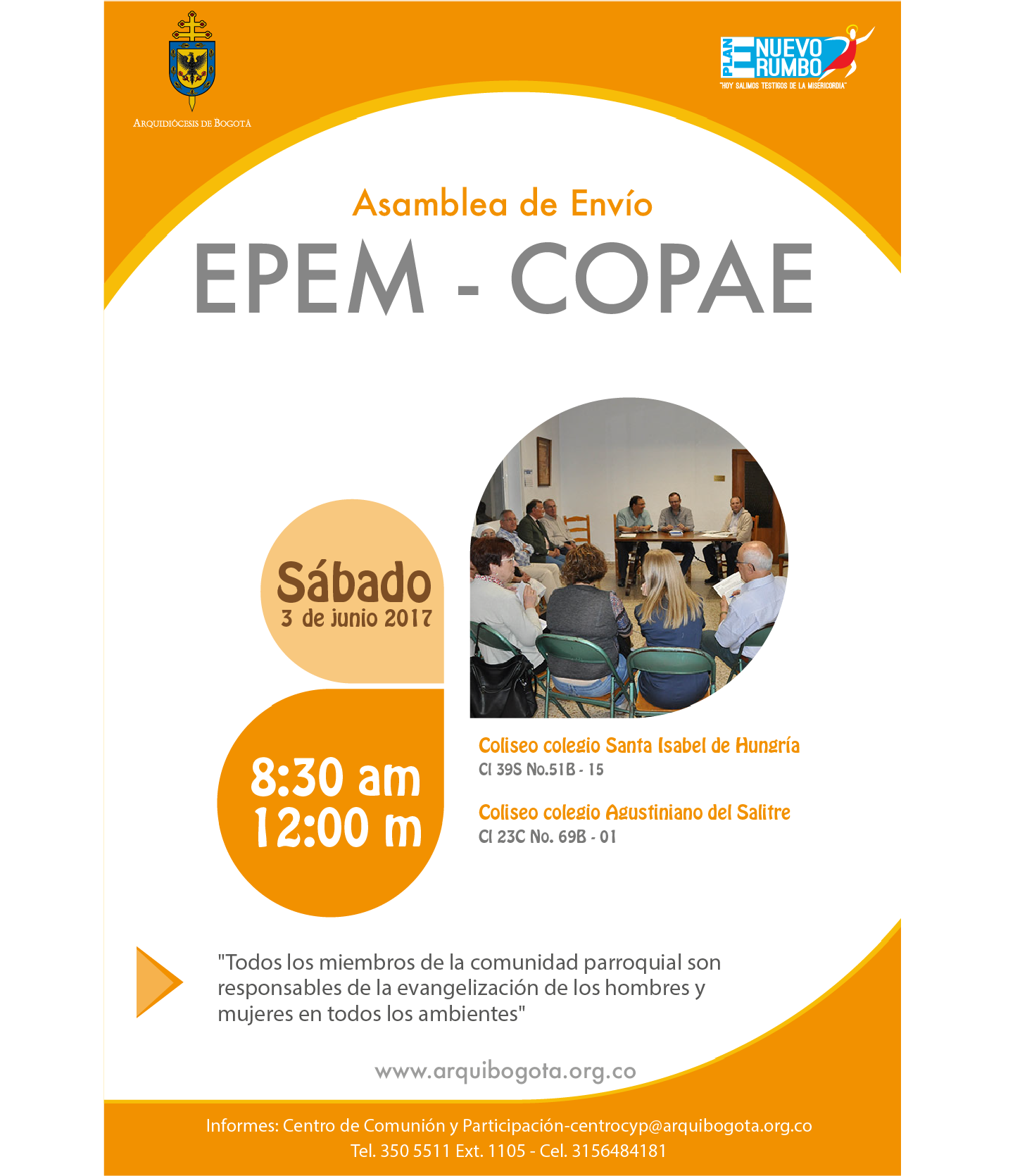 La conformación de los equipos EPEM y COPAE, que prestarán ayuda y apoyo a los párrocos en la tarea evangelizadora, se ha venido haciendo concienzudamente durante este tiempo pascual y la ceremonia de envío se hará en las asambleas del próximo sábado 3 de junio, a las que asistirán solo los nominados por el párroco y aceptados por los vicarios.