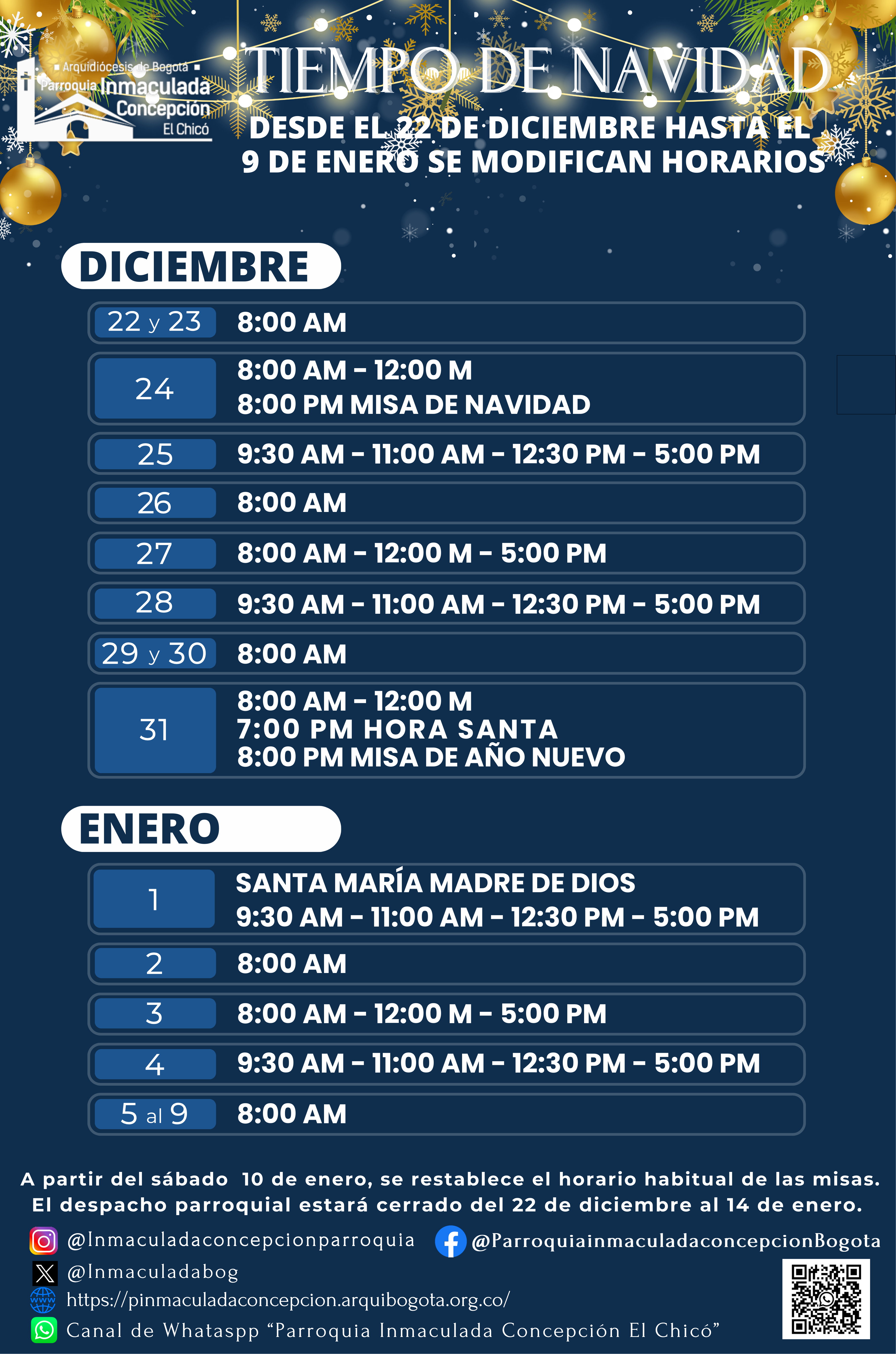 En la temporada de vacaciones se modifican los horarios de las eucaristías, entre el 22 de diciembre y el 9 de enero. A partir del sábado 10 de enero regresamos a los horarios habituales de las eucaristías.