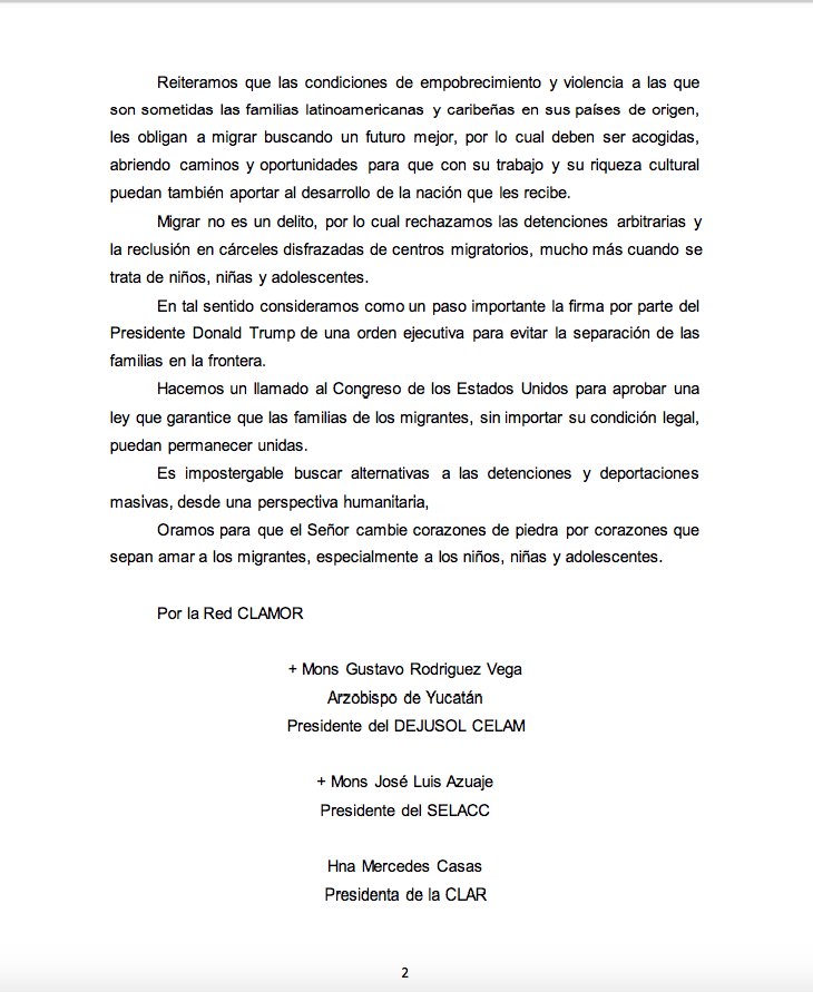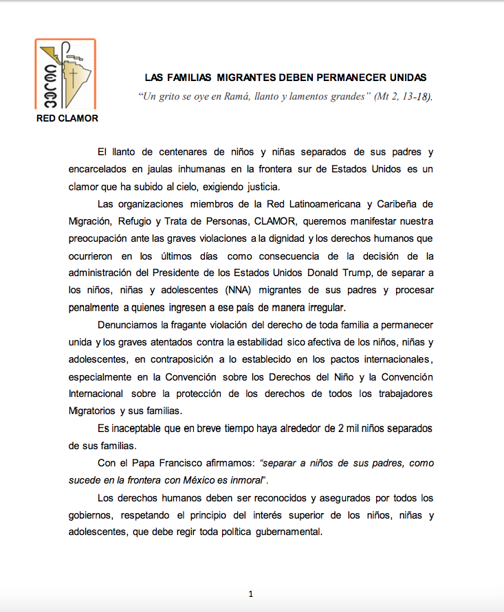Centro de información Yo quiero Noticias Boletines Eventos Artículos Canonización Mensajes del Señor Cardenal Cartas pastorales Homilías Mensajes La voz del pastor Documentos del Vaticano NoticiasLas familias migrantes deben permanecer unidas21 de Junio de 2018Por medio de un comunciado las organizaciones miembros de la Red Latinoamericana y Caribeña de Migración, Refugio y Trata de Personas, CLAMOR, manifestaron su…Foto: http://www.ororadio.com.mx/ Like 0 Dislike 0 Noticias relacionadas La Santa Misa en Semana Santa La Arquidiócesis de Bogotá celebra el nombramiento de Monseñor Paolo Rudelli en la Santa Sede Prográmate