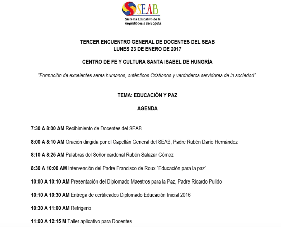 Centro de información Yo quiero Noticias Boletines Eventos Artículos Canonización Mensajes del Señor Cardenal Cartas pastorales Homilías Mensajes La voz del pastor Documentos del Vaticano NoticiasTercer encuentro general de docentes SEAB20 de Enero de 2017 Like 0 Dislike 0 Noticias relacionadas En la Catedral Primada Destacado El Catolicismo Mensaje: Monseñor Alejandro Díaz García