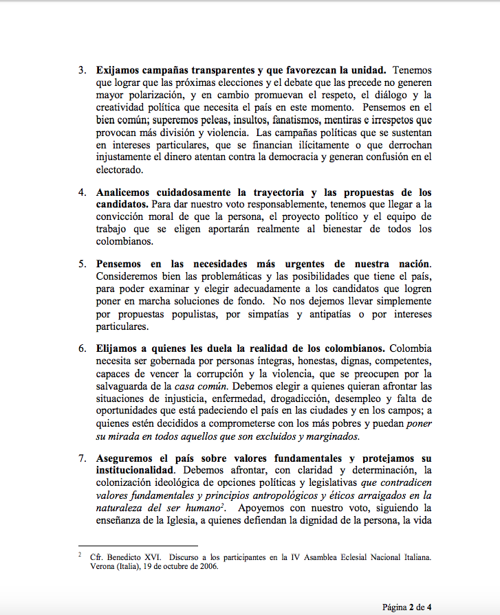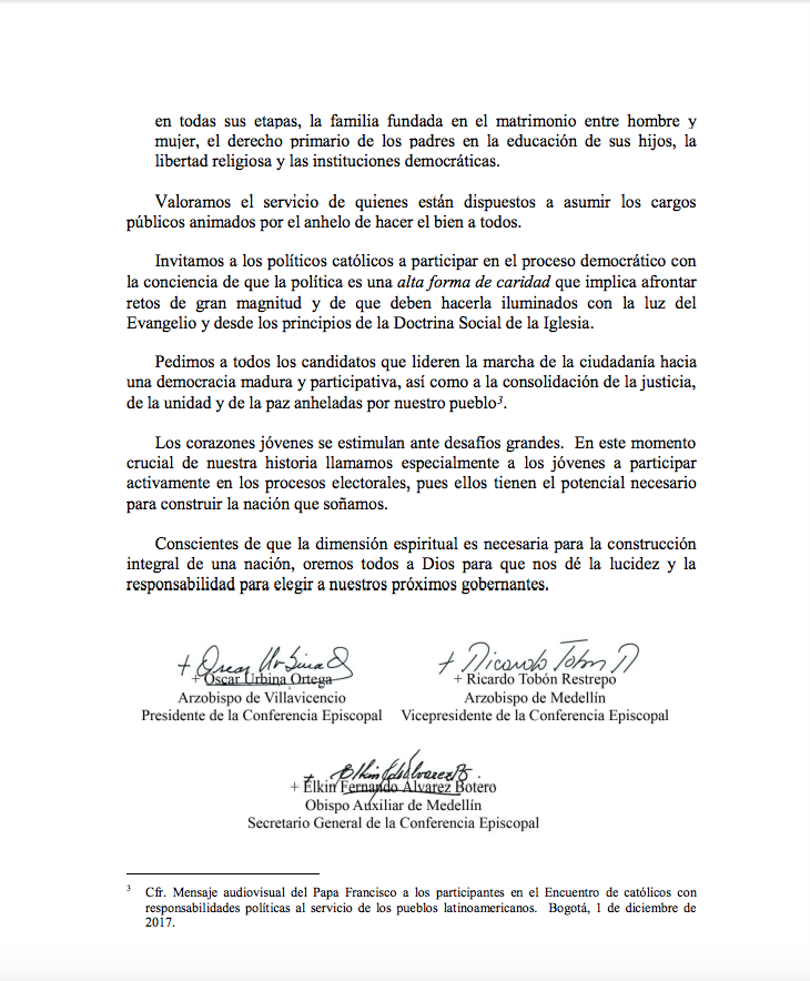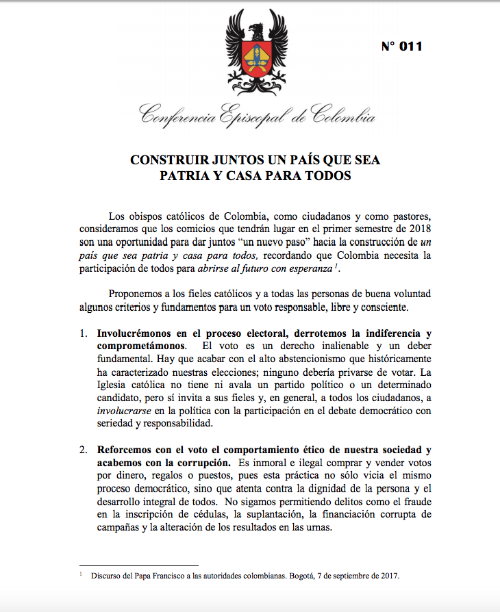 Centro de información Yo quiero Noticias Boletines Eventos Artículos Canonización Mensajes del Señor Cardenal Cartas pastorales Homilías Mensajes La voz del pastor Documentos del Vaticano NoticiasVotemos a conciencia y con responsabilidad15 de Junio de 2018Los obispos católicos de Colombia recuerdan a todos los fieles que, como ciudadanos y como cristianos, debemos votar consciente, libre y responsablemente Like 0 Dislike 0 Noticias relacionadas La Santa Misa en Semana Santa La Arquidiócesis de Bogotá celebra el nombramiento de Monseñor Paolo Rudelli en la Santa Sede Prográmate